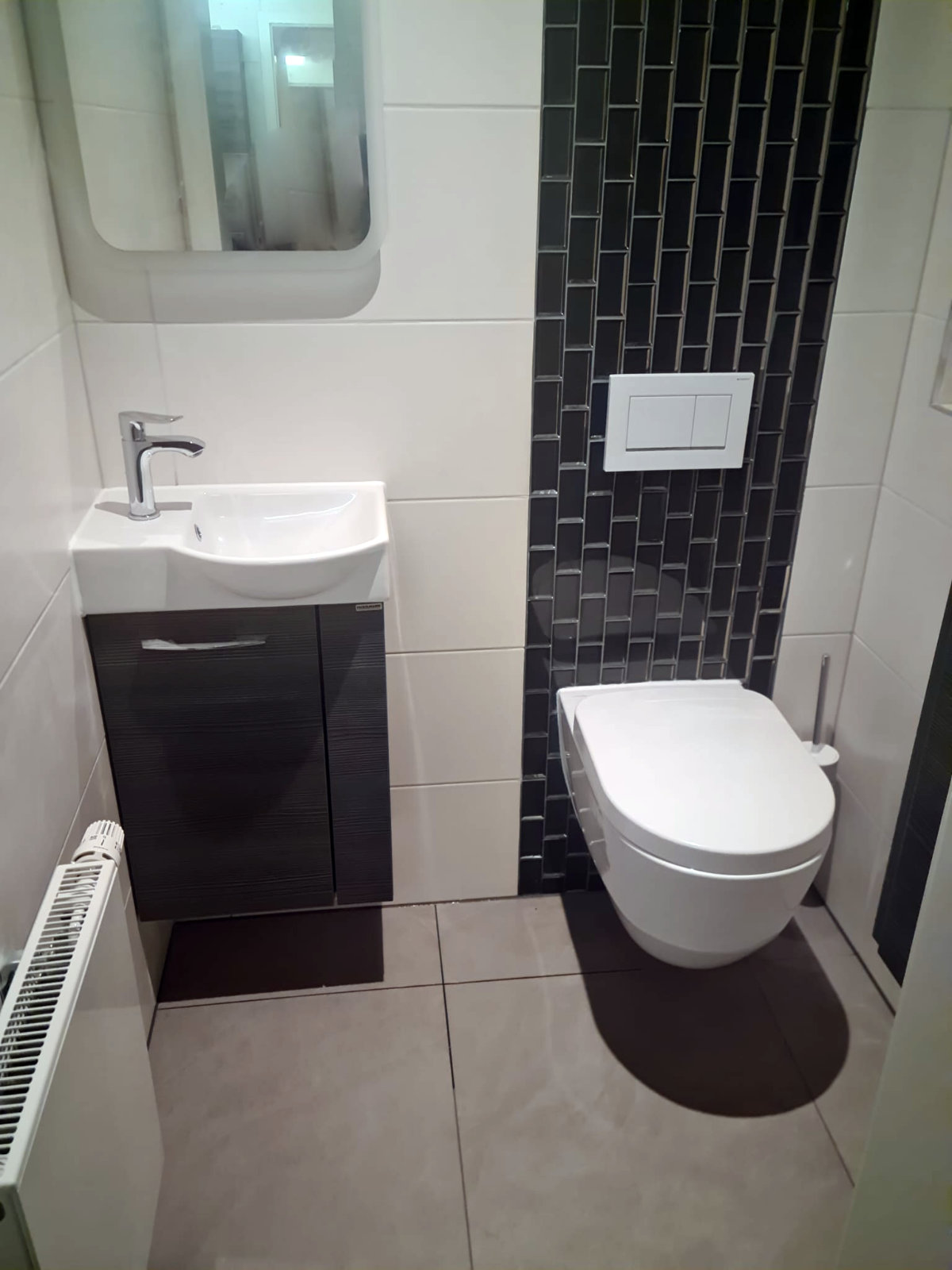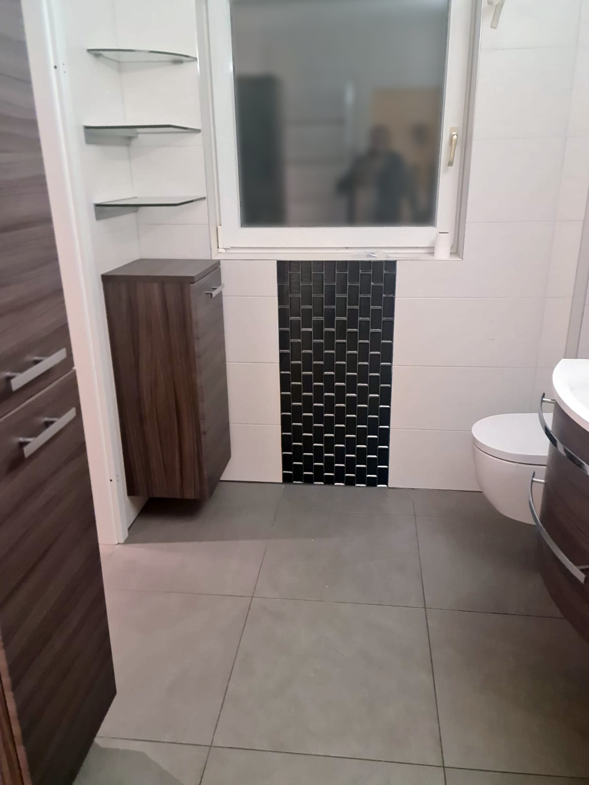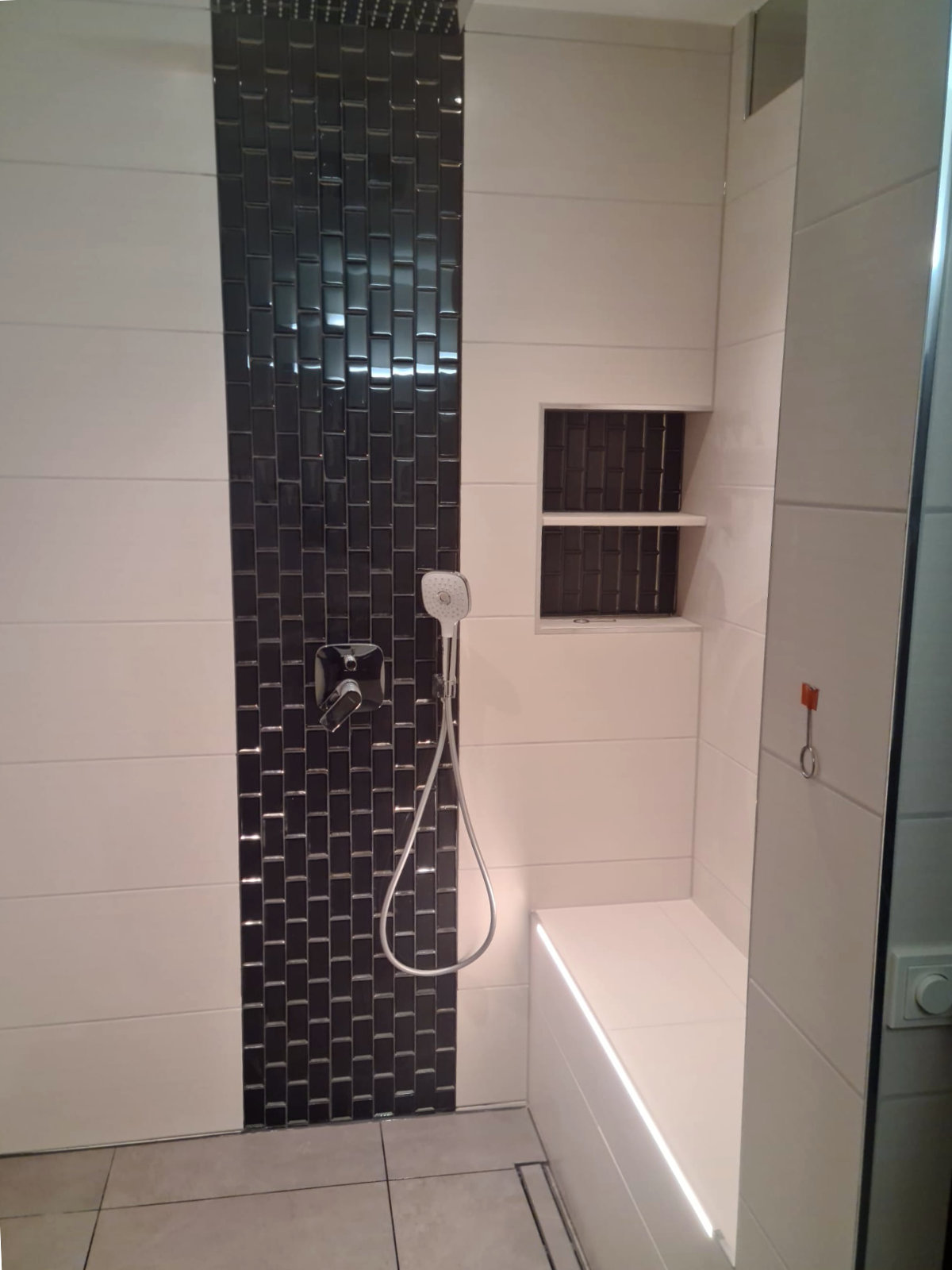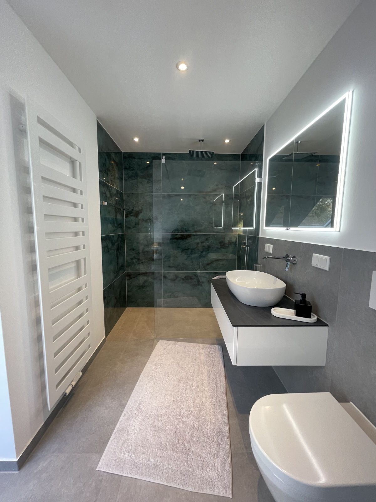 Badezimmer und Gäste-WC wurden von uns mit neuem Raumzuschnitt saniert – modern, kompakt und funktional. Hierfür wurde eine nicht-tragende Wand entfernt und an anderer Stelle eine Trockenbauwand eingezogen. So wurde Platz geschaffen für eine große, geflieste Dusche mit Sitzbank inklusive LED-Fliesenprofil. Großformatige Fliesen in Verbindung mit wandhängenden Toiletten und Badmöbeln ermöglichen eine leichte Pflege der Flächen. Dunkle, rechteckige Mosaikfliesen bilden einen schönen Kontrast.