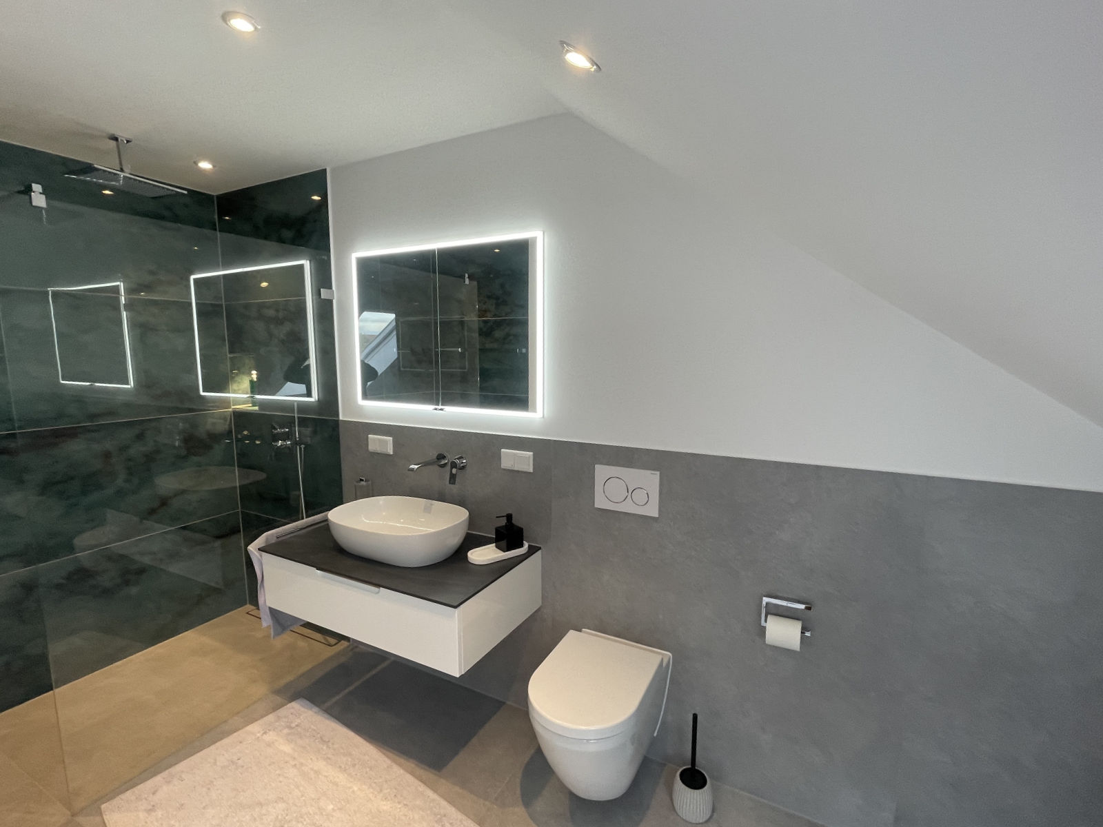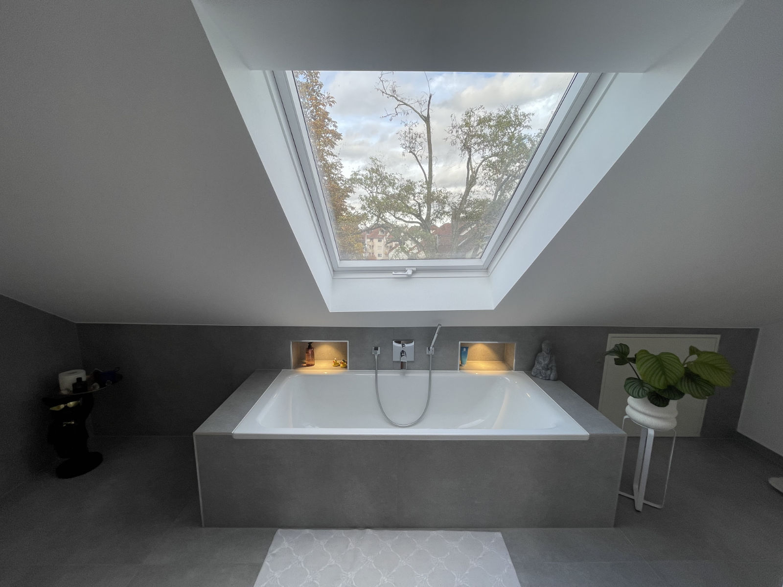 Einen kaum genutzten Abstellraum im Dachgeschoss haben wir in ein neues Bad verwandelt – mit bodengleicher Dusche, modernen Sanitärelementen und eindrucksvollen Farbakzenten. Die Fläche unter der Dachschräge wurde geschickt genutzt, um eine Badewanne mit Blick ins Freie zu platzieren. Decken-Einbauspots, ein beleuchteter Spiegel und Lichtelemente in den Ablagenischen über der Badewanne sorgen für stimmungsvolles Licht und machen das neue Badezimmer zu einem echten Wohlfühlbad.